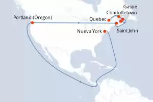 Itinerario : Nueva York, Portland (Oregon), Saint John, Charlottetown, Islas de la Madeleine, Gaspe, Quebec