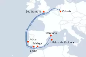 Itinerario : Southampton, Lisboa, Palma de Mallorca, Barcelona, Colonia, Malaga, Cadiz, Southampton