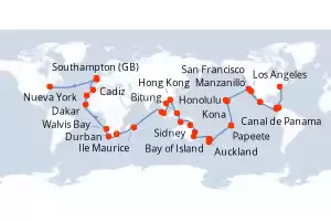 Itinerario : Nueva York, Cartagena de Indias, Canal de Panama, Fuerte amador, Manzanillo, Los Angeles, San Francisco, Honolulu, Kona, Papeete, Moorea, date, Bay of Island, Auckland, Tauranga, Sidney, Brisbane, Yorkeys Knob, Darwin, Bitung, Hong Kong, Chan May, Singapur, Port Kelang, Ile Maurice, Durban, Ciudad del Cabo, Walvis Bay, Dakar, Santa Cruz de Tenerife, Cadiz, Southampton, Le Havre, Nueva York