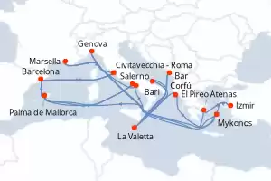 Itinerario : Barcelona, Civitavecchia - Roma, Marsella, Salerno, Mykonos, Genova, Mykonos, Izmir, El Pireo Atenas, Corfú, La Valetta, Bar, La Valetta, Bari, Palma de Mallorca, Nápoles, Palma de Mallorca, Barcelona, Civitavecchia - Roma