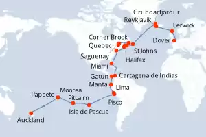 Itinerario : Dover, Lerwick, Reykjavik, Grundarfjordur, Isafjordhur, St Johns, Corner Brook, Quebec, Saguenay, Charlottetown, Sidney, Halifax, Nueva York, Miami, Cartagena de Indias, Gatun, Manta, Lima, Pisco, Isla de Pascua, Pitcairn, Papeete, Moorea, Auckland