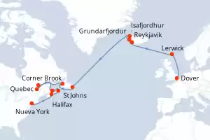 Itinerario : Dover, Lerwick, Reykjavik, Grundarfjordur, Isafjordhur, St Johns, Corner Brook, Quebec, Saguenay, Charlottetown, Sidney, Halifax, Nueva York, Miami, Cartagena de Indias, Gatun, Manta, Lima, Pisco, Isla de Pascua, Pitcairn, Papeete, Moorea, Auckland, Sidney