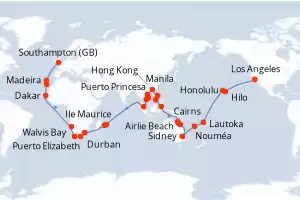 Itinerario : Los Angeles, Hilo, Honolulu, date, Lautoka, Nouméa, Sidney, Airlie Beach, Townsville, Cairns, Bitung, Puerto Princesa, Manila, Hong Kong, Chan May, Nha Trang, Phu My, Singapur, Ile Maurice, Isla de la Reunion, Durban, Puerto Elizabeth, Ciudad del Cabo, Walvis Bay, Dakar, Santa Cruz de Tenerife, Madeira, Southampton
