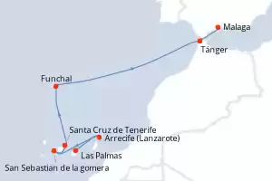 Itinerario : Las Palmas, Arrecife (Lanzarote), San Sebastian de la gomera, Santa Cruz de Tenerife, Funchal, Tánger, Malaga