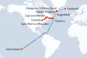 Itinerario : Reykjavik, Pasaje de Christian Sund, Glacier Kujjaleq, Augpilatok, Adamstown, St Johns, Saint Pierre y Miquelon, Cap-aux-Meules, Tadoussac, Montreal, Golfe du saint laurent, Toronto
