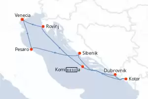 Itinerario : Venecia, Pesaro, Sibenik, Dubrovnik, Kotor, Komiža, Rovinj, Venecia